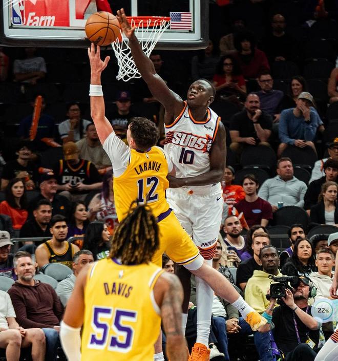 暂停回来拉拉维亚抛中一球,狄龙传球失误。东契奇后仰跳投不中艾顿积极拼抢到二次进攻机会,东契奇抛投不中布耶运球投三分太阳重新拿回领先优势,东契奇转身打成2+1,狄龙持球往里打后仰跳投还中,东契奇到内线骗起马威又有罚球机会,两罚全中比分来到48-47。上半场比赛还剩最后四分半钟,东契奇传球失误马威拿球暴扣,文森特三分不中狄龙连得4分,太阳53-48领先5分,东契奇又是失误马威空接暴扣,东契奇篮下停球失误,吉莱斯皮追身大空位三分稳稳命中,58-50太阳领先8分,第二还有两分多钟湖人单节出现10次失误,布克腹股沟出现伤病,回到更衣室迟迟没有回来!回到比赛狄龙又命中三分,东契奇上篮止血,奥尼尔三分也有太阳三分感觉回来了,东契奇三分三不沾狄龙反击暴扣单节15分了,狄龙压哨三分不中湖人半场52-66落后14分!